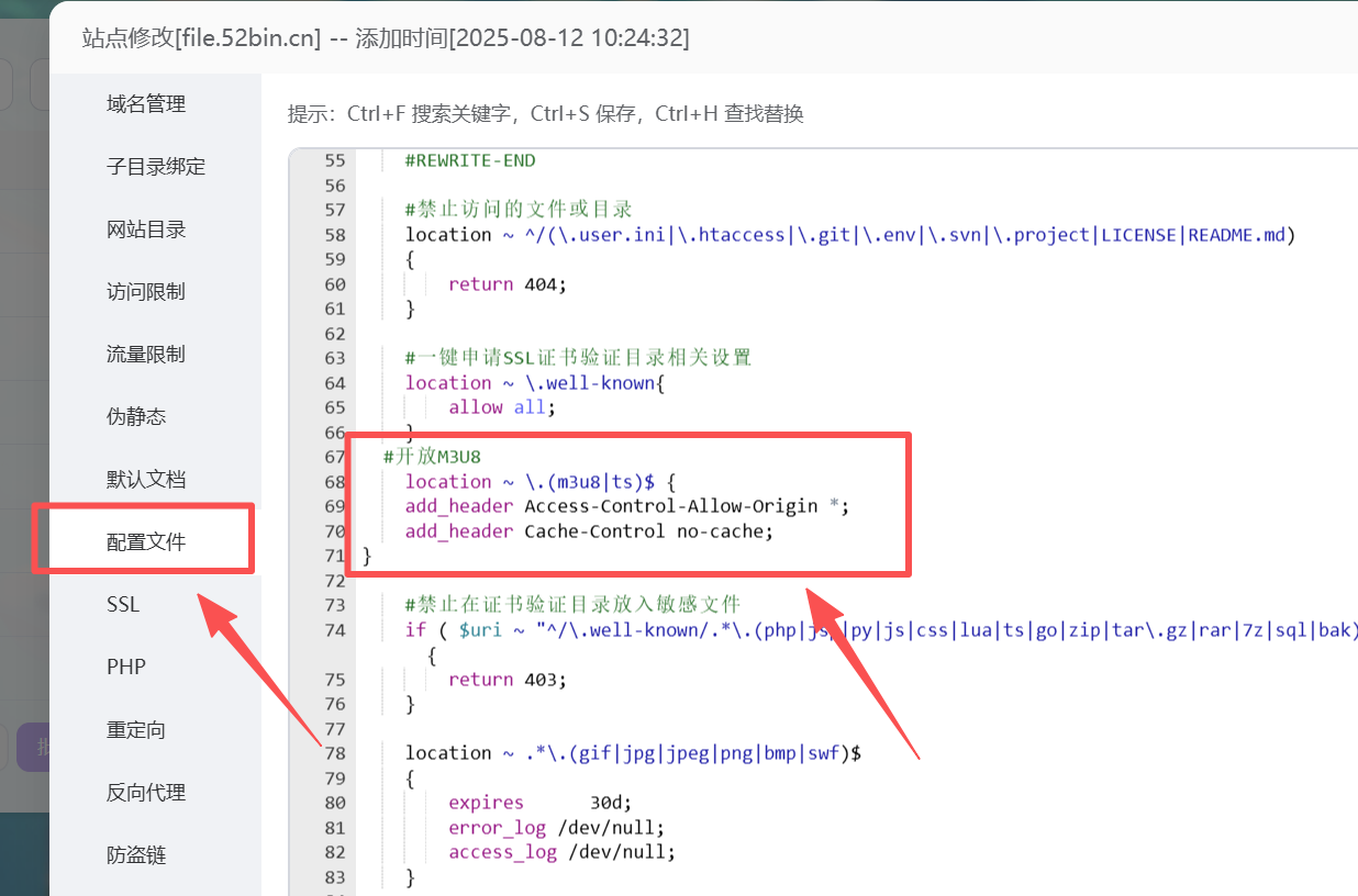 需要在Nginx配置中任意位置增加以下代码:#开放M3U8 location ~ \.(m3u8|ts)$ { add_header Access-Control-Allow-Origin *; add_header Cache-Control no-cache;}复制代码示例: