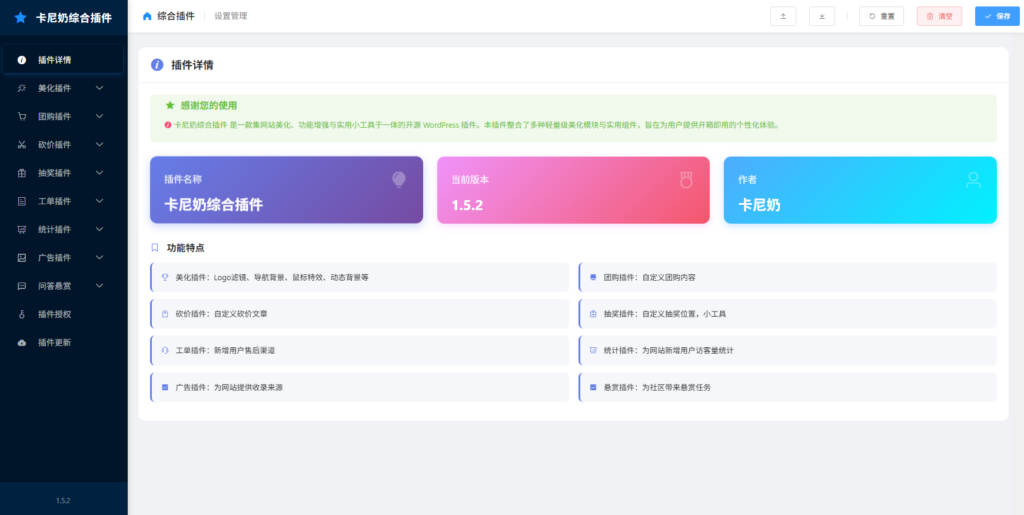| WordPress子比主题(Zibll)重磅发布:综合功能插件“八合一”详细介绍 适用主题: WordPress 子比主题 (Zibll) 插件名称: 子比主题综合插件-八合一 发布日期: 2026年01月12日 功能范围:美化插件、团购插件、砍价插件、抽奖插件、工单插件、统计插件、广告插件、悬赏插件 下载地址:https://wwaoz.lanzoum.com/izpV03fy8igf 插件核心功能详解 这款综合插件并非简单的功能堆砌,而是针对子比主题的深度优化与扩展。它主要由以下八大核心模块组成: 1. 炫酷美化模块 (Beauty Module) * 功能亮点: 告别千篇一律的网站风格,让你的网站与众不同。 * 详细介绍: * 视觉特效: 集成多种CSS/JS特效,如鼠标点击爆炸特效(五彩斑斓、社会主义核心价值观等)、浪漫樱花飘落、枫叶纷飞、雪花飘落等季节性特效。 * 界面优化: 提供多种网站背景(炫彩夜空、淡蓝遐想等)、导航栏皮肤(未来科技、紫色薰衣等)、字体选择以及侧边栏美化。 * 细节打磨: 包含头像呼吸光环、鼠标悬停旋转放大、文章列表悬停上浮、水波纹效果、彩色滚动条、Logo扫光动画等。 * 特殊模式: 支持全局灰色主题(适用于纪念日),以及多种鼠标皮肤和光圈跟随效果。 2. 社交团购模块 (Group Buying Module) * 功能亮点: 激发用户社交裂变,快速提升网站商品销量和用户活跃度。 * 详细介绍: * 拼团功能: 支持设置多人拼团、阶梯拼团等多种模式。 * 便捷分享: 用户可以轻松将团购链接分享至微信、朋友圈等社交平台。 * 进度可视: 清晰展示团购倒计时和参与人数,营造紧张抢购氛围。 * 无缝对接: 与子比主题的支付系统完美融合,购物流程顺畅无阻。 3. 互动砍价模块 (Bargaining Module) * 功能亮点: 增加用户互动乐趣,利用“砍一刀”心理促进用户主动拉新。 * 详细介绍: * 发起砍价: 用户可以为自己喜欢的商品发起砍价,并邀请好友帮忙。 * 随机砍价: 系统支持设置随机砍价金额,增加趣味性。 * 实时通知: 实时更新砍价进度和剩余时间,刺激用户尽快完成支付。 * 数据统计: 后台可清晰查看所有砍价活动的数据,方便运营分析。 4. 营销抽奖模块 (Lottery Module) * 功能亮点: 低成本获取高回报的用户活跃工具,可用于节日活动或日常推广。 * 详细介绍: * 多种玩法: 支持大转盘、刮刮乐、砸金蛋等多种抽奖形式。 * 规则自定义: 灵活设置抽奖条件(如积分、等级限制)、奖品库存和中奖概率。 * 奖品丰富: 支持设置虚拟奖品(积分、优惠券)或实物奖品。 * 记录公开: 前台展示中奖名单,增加活动的透明度和可信度。 5. 高效工单模块 (Ticket System Module) * 功能亮点: 建立专业的用户反馈与客服体系,提升网站服务品质。 * 详细介绍: * 提交与追踪: 用户可以方便地提交问题或建议,并随时查看处理进度。 * 分类处理: 支持工单分类(如技术问题、商务合作),方便管理员快速响应。 * 站内信通知: 工单状态变更时,系统会自动发送站内信通知用户。 * 闭环管理: 从提交、受理、回复到关闭,实现问题处理的全流程闭环管理。 6. 全局统计模块 (Statistics Module) * 功能亮点: 用数据说话,全方位展示网站的成长历程和活跃状态。 * 详细介绍: * 数据展示: 在侧边栏或底部展示网站的总访问量(UV/PV)、文章数、会员数、今日活跃用户等关键数据。 * 动态效果: 数字滚动增长动画,让数据展示更生动。 * 详细日志: 后台提供详细的数据报表,帮助你分析用户行为和网站流量趋势。 * 个性化设置: 支持自定义统计图标和显示的文字内容。 7. 智能广告模块 (Advertising Module) * 功能亮点: 优化广告位管理,最大化网站流量变现收益。 * 详细介绍: * 多位置支持: 支持在文章页头部、底部、侧边栏、弹窗等多种位置投放广告。 * 多种格式: 支持图片、代码(如JS广告联盟代码)、纯文本等多种广告形式。 * 排版美化: 对广告区域进行美化,使其更融入网站整体风格,减少用户反感。 * 数据监控: (可选)记录广告点击数据,评估广告投放效果。 8. 悬赏任务模块 (Reward Module) * 功能亮点: 构建活跃的问答或任务社区,让用户帮你解决问题或创造内容。 * 详细介绍: * 发布悬赏: 用户可以发布问题或任务,并设置悬赏积分或金额。 * 接单回答: 其他用户可以接单回答或提供解决方案。 * 采纳与支付: 提问者满意后可采纳答案,悬赏金将自动发放给回答者。 * 激励机制: 形成“提问-解答-奖励”的良性循环,极大地提高用户粘性。 ![]() ![]() ![]() |
