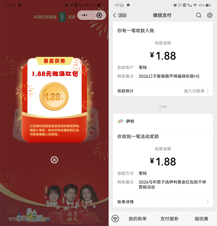 伊利小游戏抽0.66-6.6元微信红包